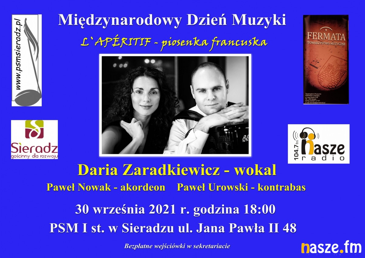 Międzynarodowe święto muzyki i muzyków przypada 1 października. Dzień wcześniej w sali koncertowej Państwowej Szkoły Muzycznej I st. w Sieradzu, z tej okazji, odbędzie się koncert Darii Zaradkiewicz. Na scenie z wokalistką wystąpią Paweł A. Nowak (akordeon) i Paweł Urowski (kontrabas). W tym roku będzie to muzyczna podróż Francji.