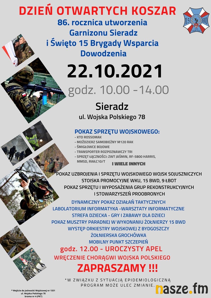 Zbliżają się obchody 86. rocznicy utworzenia Garnizonu Sieradz i zarazem Święta 15 Sieradzkiej Brygady Wsparcia Dowodzenia. Z tej okazji wojskowi zapraszają wszystkich zainteresowanych na Dzień Otwartych Koszar. To wydarzenie będzie miało miejsce w najbliższy piątek. Brygada zaprasza w godz. 10-14.