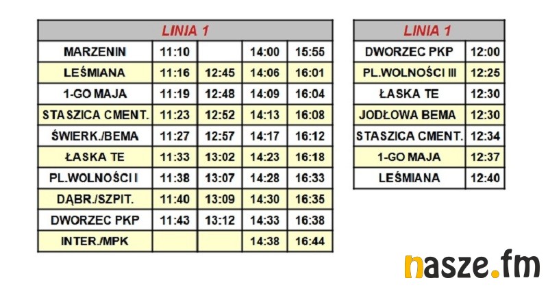 - Linia nr 1 na trasie Marzenin - Dworzec PKP o godz. 11:10, 14:00, 15:55