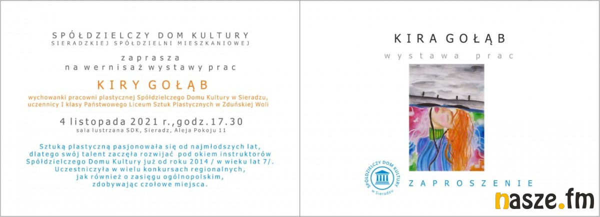 Spółdzielczy Dom Kultury w Sieradzu zaprasza dziś na wernisaż wystawy prac Kiry Gołąb. Kira jest wychowanką pracowni plastycznej SDK i uczennicą I klasy Państwowego Liceum Sztuk Plastycznych w Zduńskiej Woli.