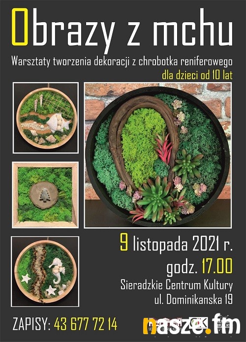 Od kilku lat, za sprawą coraz większego nacisku na ekologię, stał się modnym wystrojem wnętrz, a jego miękkość i plastyczność oraz trwałość pozwala na wykonanie przepięknych obrazów i innych dekoracji. Na warsztatach tworzyć będziemy obrazy z wykorzystaniem chrobotka reniferowego oraz innych rekwizytów, nawiązując do jesienno-zimowej aury oraz zbliżających się świąt. Konstruowanie takich dekoracji wymaga ostrożności, gdyż mech przykleja się klejem na gorąco-stąd minimalna granica wiekowa uczestników to 10 lat.