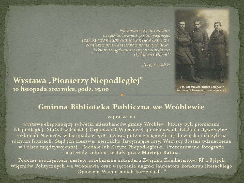 Gminna Biblioteka Publiczna we Wróblewie zaprasza w środę 10 listopada o godz. 15:00 na otwarcie wystawy eksponującej sylwetki mieszkańców gminy Wróblew, którzy byli pionierami Niepodległej.