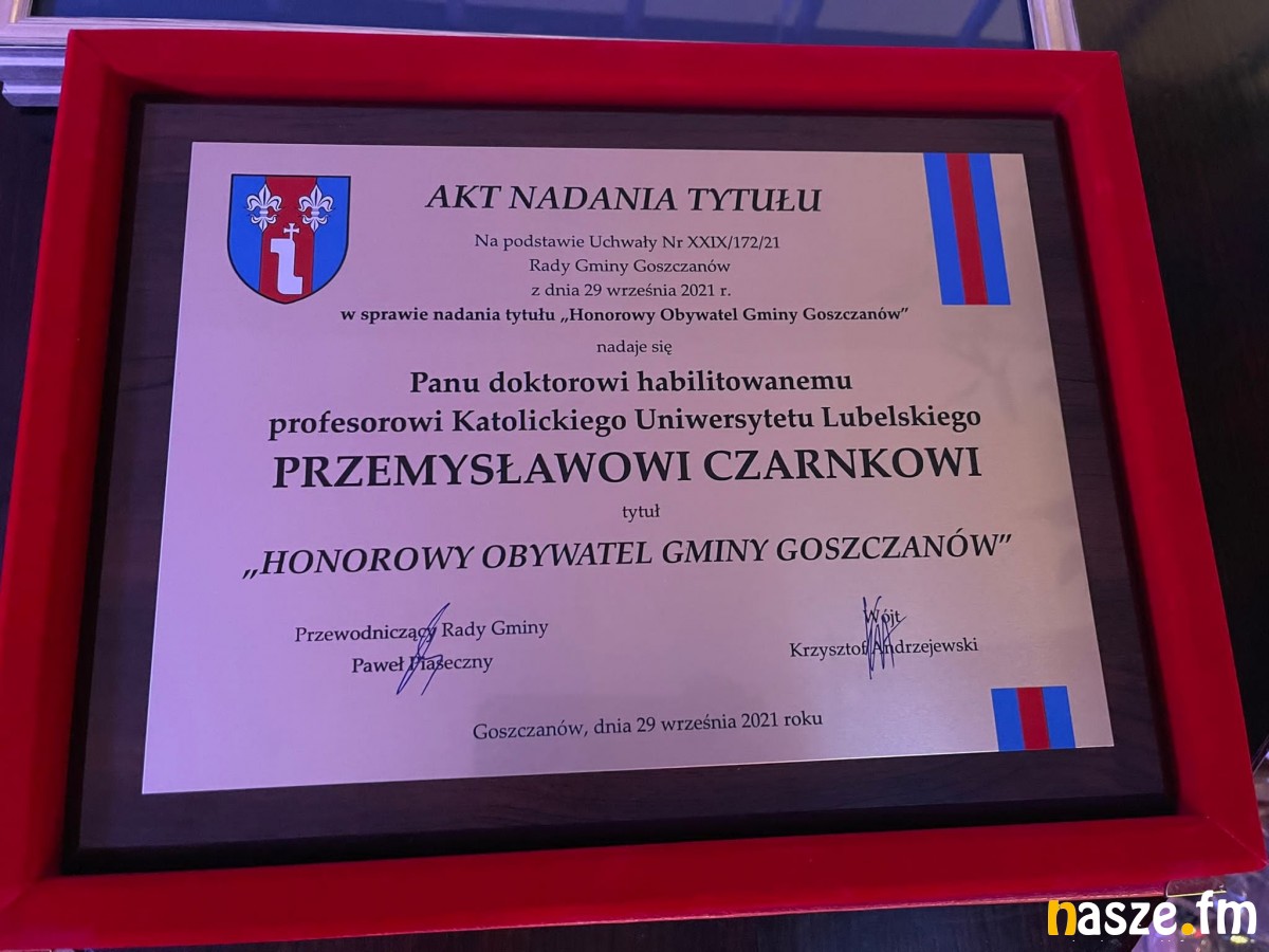 Rada Gminy Goszczanów 29 września 2021 roku jednogłośnie podjęła stosowną uchwałę. Przemysław Czarnek, po księdzu kanoniku Zdzisławie Królu, stał się drugim Honorowym Obywatelem Gminy Goszczanów.
