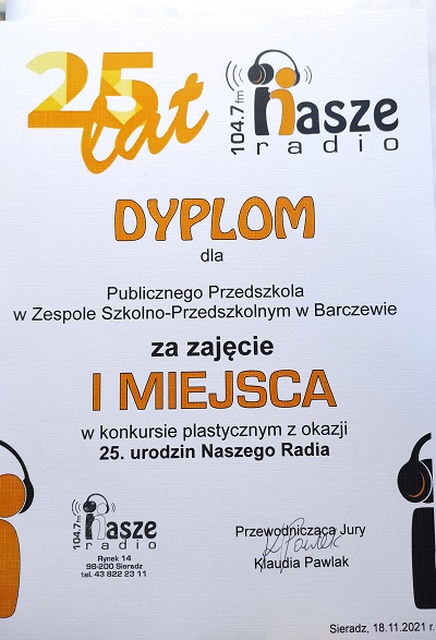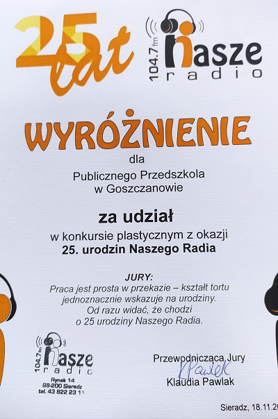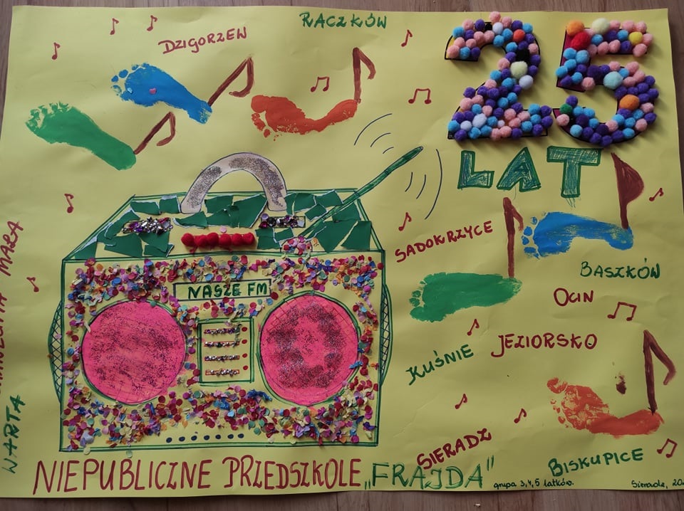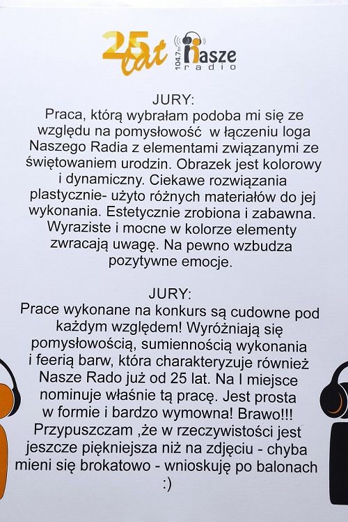 Z okazji naszych 25.urodzin zorganizowaliśmy konkurs dla placówek przedszkolnych z regionu. Zadanie polegało na wykonaniu pracy plastycznej pod hasłem "25.urodziny Naszego Radia". Jury wyłoniło zwycięzcę. I miejsce zajęło Publiczne Przedszkole w Barczewie. Nagrodą była wycieczka do naszej redakcji, występ na żywo na antenie i zaproszenie na pizzę.