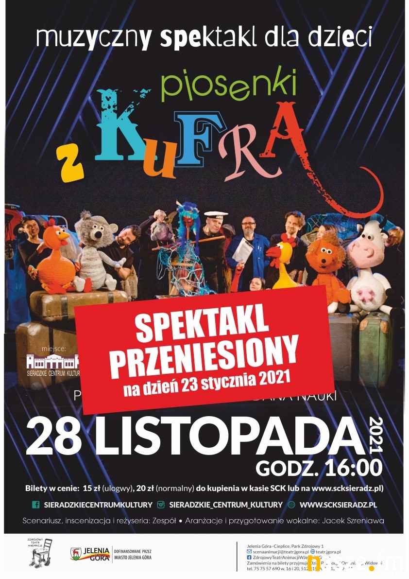 Zaplanowany na niedzielę 28 listopada spektakl został przełożony na 23 stycznia. Jak informuje Sieradzkie Centrum Kultury mali widzowie obejrzą widowisko "Piosenki z kufra" w późniejszym terminie z powodu choroby aktorów.
