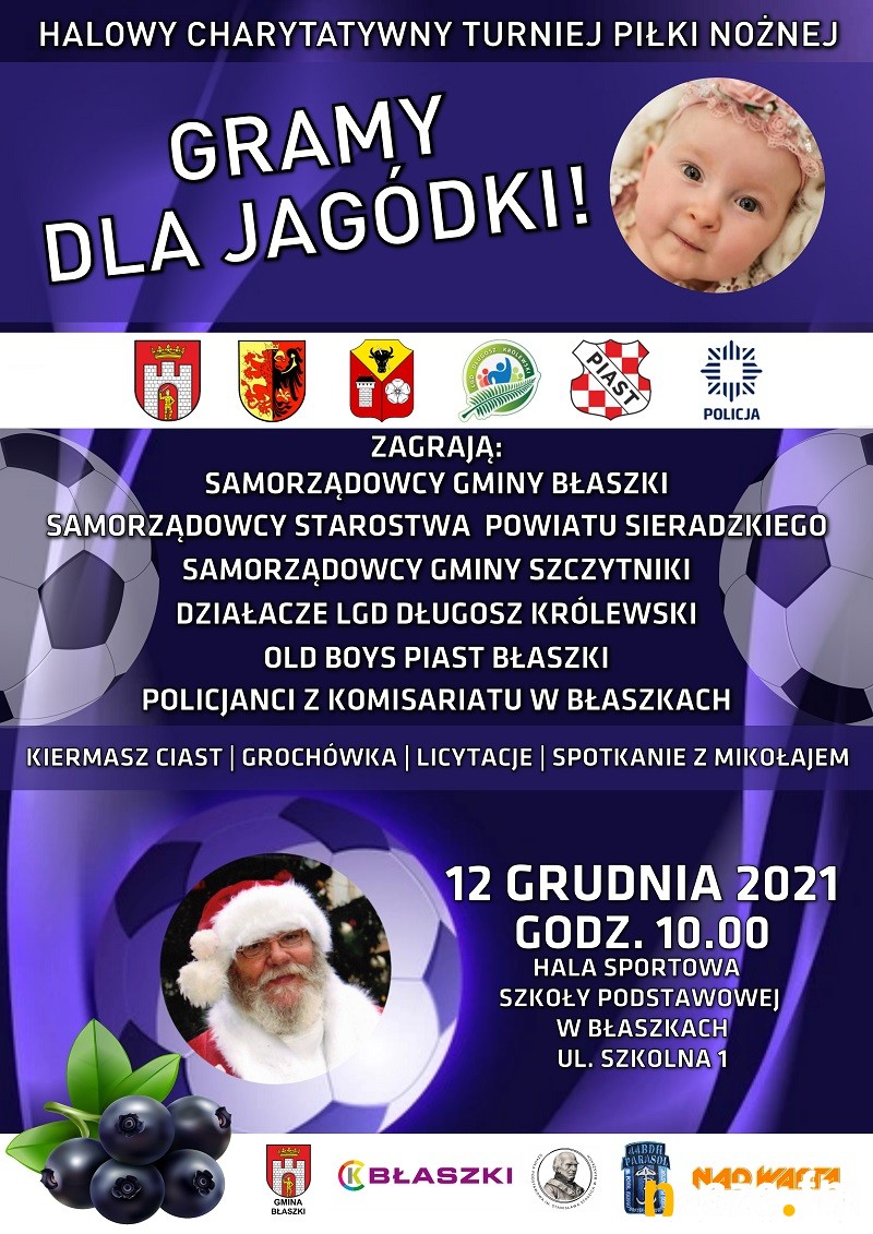 W najbliższą niedzielę w Błaszkach odbędzie się Halowy Charytatywny Turniej Piłki Nożnej. Podczas turnieju wystąpią wyjątkowe reprezentacje, a to wszystko dla Jagódki - malutkiej mieszkanki Iwanowic, która zmaga się z bardzo ciężką chorobą jaką jest SMA1. Zaplanowano mnóstwo atrakcji. Licytacje, kiermasz ciast oraz spotkanie z Mikołajem.
