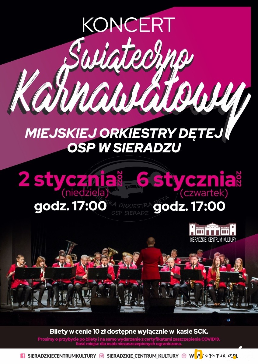 Na te koncerty zaprasza Miejska Orkiestra Dęta OSP w Sieradzu, zaplanowano je na 2 i 6 stycznia w Teatrze Miejskim w Sieradzu. Rozpoczną się o godz. 17:00. Będą podzielone na dwie części. Pierwsza będzie nawiązaniem do świąt Bożego Narodzenia, druga do karnawału.