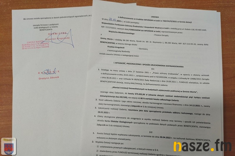 Burmistrz Warty podpisał umowę dotacyjną z Wojewódzkim Funduszem Ochrony Środowiska i Gospodarki Wodnej w Łodzi na realizację zadania pn. "Montaż instalacji fotowoltaicznych na budynkach użyteczności publicznej w Gminie Warta".