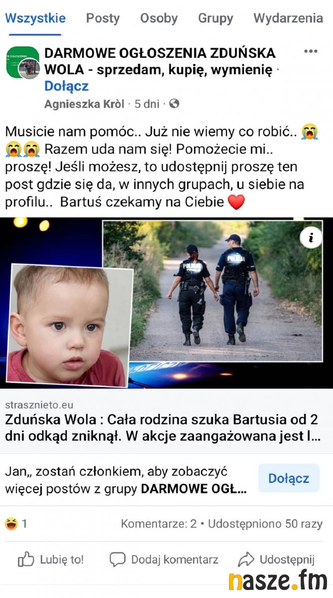 - Musicie nam pomóc. Już nie wiemy co robić. Razem uda nam się! Pomóżcie mi...proszę! Liczy się każda minuta - tak brzmiący apel krąży od kilku dni na portalach społecznościowych. Dotyczy on rzekomego zaginięcia kilkuletniego chłopczyka o imieniu Bartuś oraz dziewczynki Ani. Pojawiło się też ogłoszenie o uprowadzeniu "córki sąsiadki" i załączono nagranie do którego rzekomo miało dojść w Zduńskiej Woli.