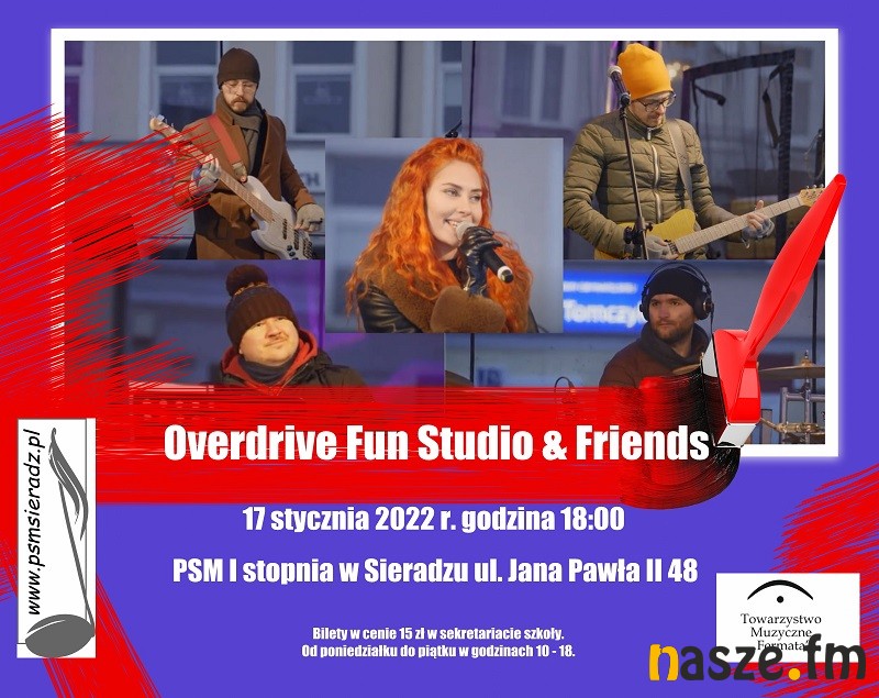Towarzystwo Muzyczne "Fermata" zaprasza 17 stycznia na koncert grupy Overdrive Fun Studio & Friends, która zagra najpopularniejsze piosenki zimowe oraz świąteczne - polskie oraz zagraniczne. Koncert odbędzie się o godzinie 18.00 w sali koncertowej Państwowej Szkoły Muzycznej I stopnia w Sieradzu.