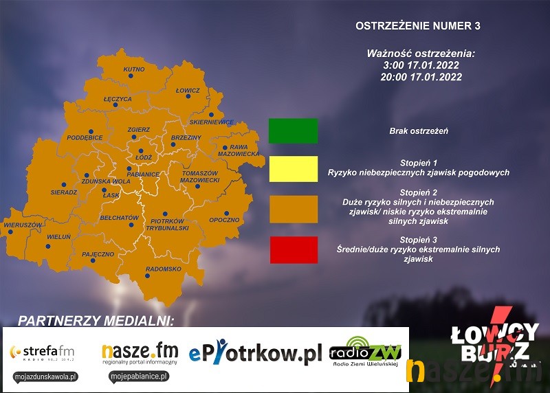 Łowcy Burz Łódzkie wydali ostrzeżenie dla całego województwa łódzkiego przed silnym wiatrem. Zacznie obowiązywać dziś w nocy. Kulminacja nastąpi jutro w godzinach przedpołudniowych i około południowych. Maksymalne porywy wiatru mogą przekraczać 95 km/h.