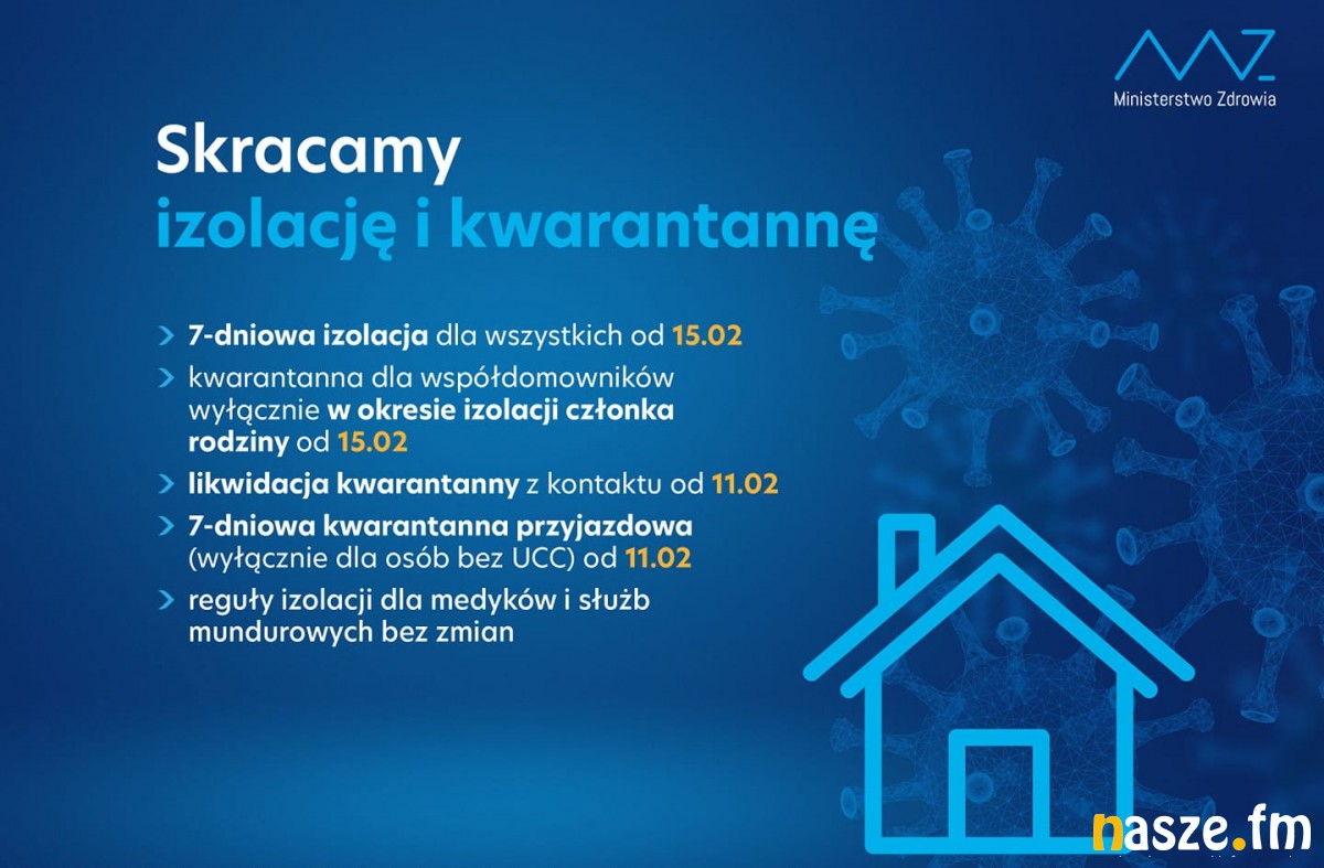 - Od 15 lutego będzie stosowana siedmiodniowa izolacja (zamiast 10-dniowej izolacji dla osób zakażonych koronawirusem).