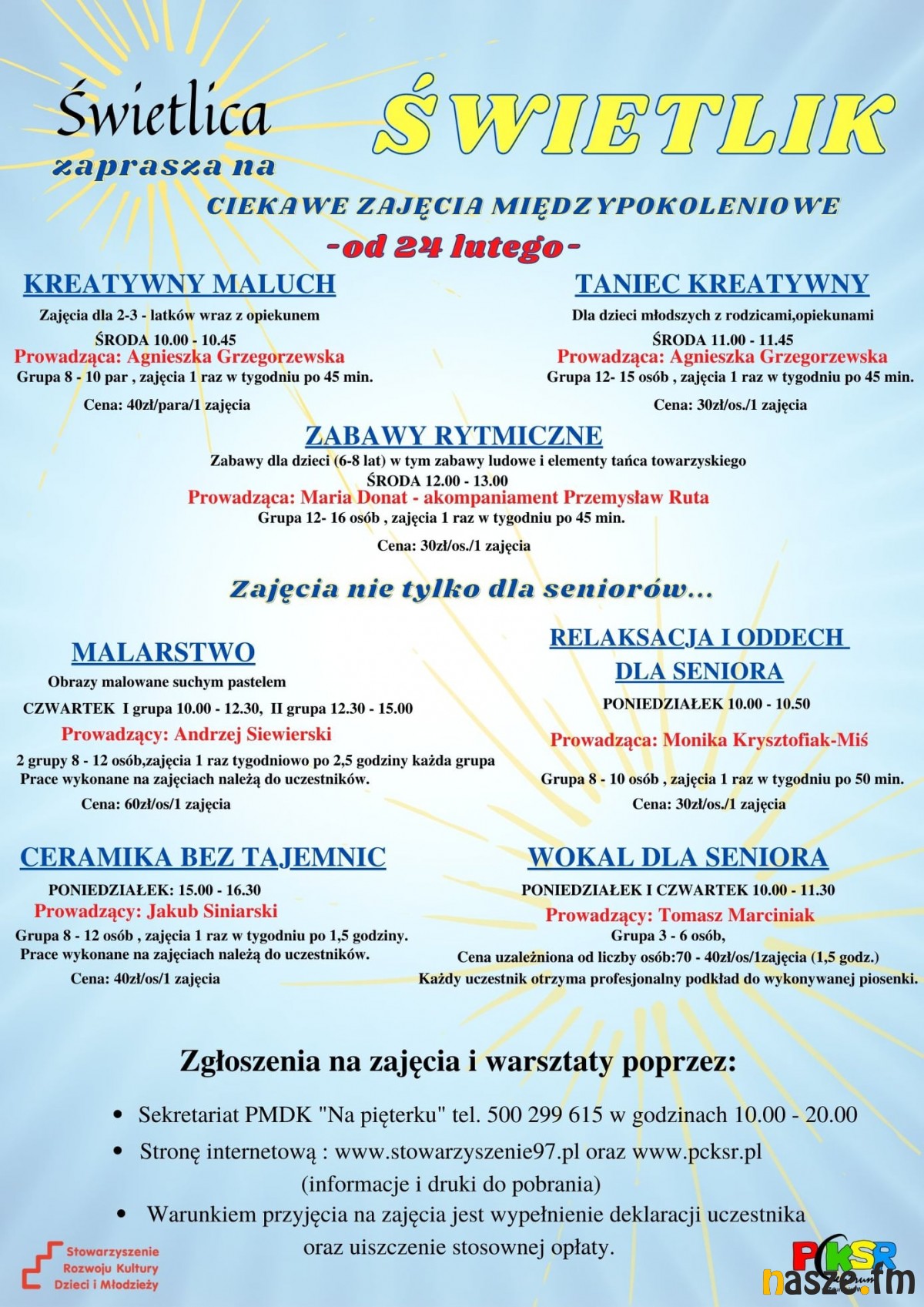 Świetlica "Świetlik" prowadzona przez Stowarzyszenie Rozwoju Kultury Dzieci i Młodzieży we współpracy z Powiatowym Młodzieżowym Domem Kultury "Na pięterku" w Zduńskiej Woli zaprasza na cykl zajęć dla dzieci, młodzieży oraz dorosłych zainteresowanych aktywnym i kreatywnym spędzaniem wolnego czasu.