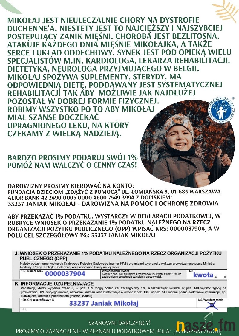 W minionym tygodniu rozpoczęła się akcja pomocy w formie licytacji dla 5-letniego Mikołaja Janiaka z Sieradza, który walczy ze śmiertelną chorobą - Dystrofią Duchenne’a. Codzienna walka o sprawność chłopca sprowadza się do ogromnych kosztów. Aby wesprzeć starania rodziców w walce o sprawność Mikołajka wystarczy wziąć udział w licytacjach na specjalnie w tym celu utworzonej grupie na Facebooku.