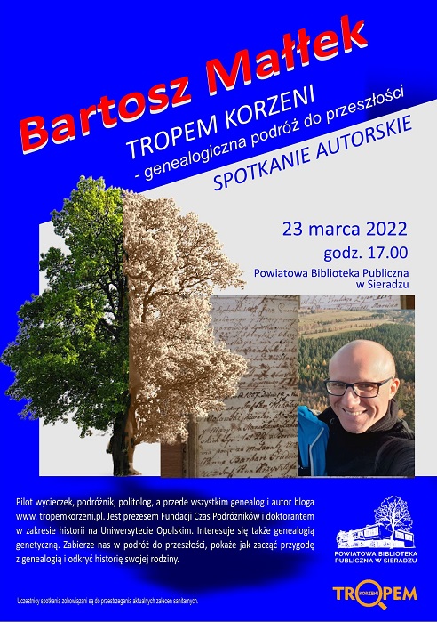 Jutrzejsze spotkanie jest zatytułowane "Tropem korzeni - genealogiczna podróż do przeszłości". O tym jak zacząć przygodę z genealogią i odkryć historię swojej rodziny opowie Bartosz Małłek. Pilot wycieczek, podróżnik, politolog, a przede wszystkim genealog i autor bloga www.tropemkorzeni.pl. Jest prezesem Fundacji Czas Podróżników i doktorantem w zakresie historii na Uniwersytecie Opolskim. Interesuje się także genealogią genetyczną.