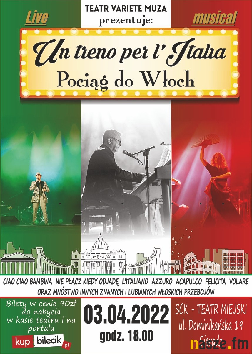 Un treno per l'Italia czyli "Pociąg do Włoch" to przedstawienie taneczno-muzyczne z największymi hitami muzyki włoskiej. W niedzielę w Teatrze Miejskim w Sieradzu będzie okazja, żeby je obejrzeć.