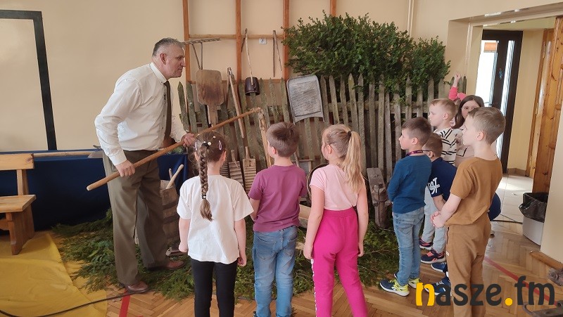 Dzieci obserwowały też wrób tradycyjnego ciasta drożdżowego oraz różne sposoby robienia swetrów na drutach. Uczniowie obejrzeli również tradycyjne wyposażenie gospodarstwa wiejskiego.