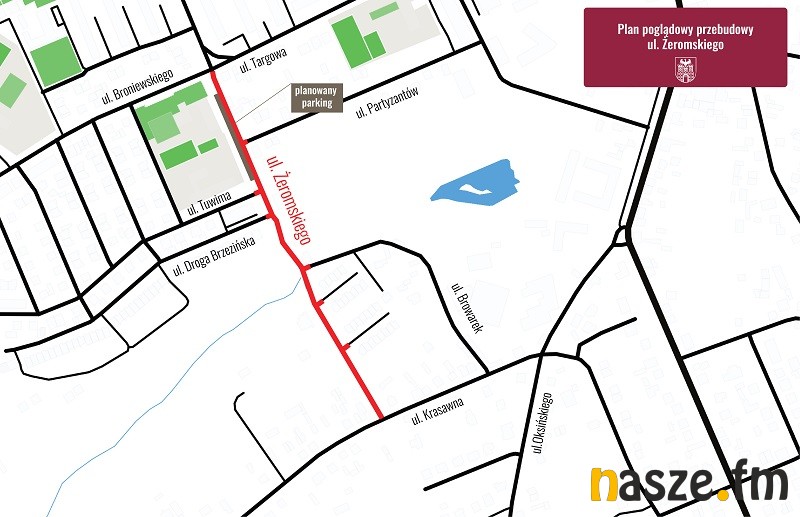 Zakres prac obejmie ok. 480 m drogi czyli całość ul. Żeromskiego. W ramach przebudowy zaplanowano wykonanie nowej konstrukcji nawierzchni jezdni o szerokości 6 m. Po obu jej stronach (na odcinku od skrzyżowania z ulicami Targową/Broniewskiego/Zajęczą do skrzyżowania z ul. Browarek) wykonane zostaną chodniki o szerokości 2 m. Od skrzyżowana z ul. Browarek do ul. Krasawnej, chodnik przewidziano po lewej stronie jezdni.