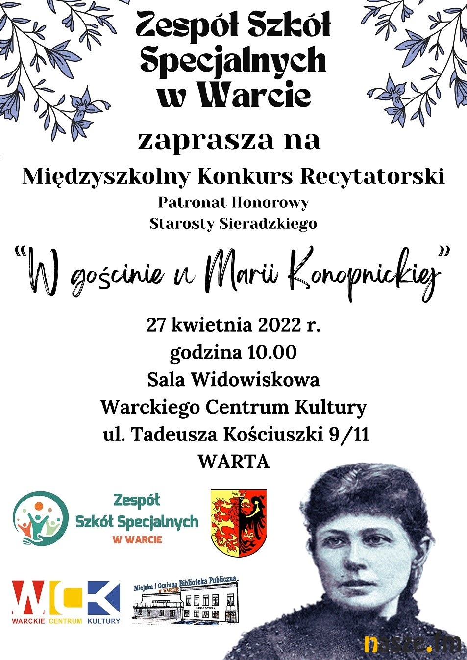 Organizatorem międzyszkolnego konkursu recytatorskiego, którego tegoroczna edycja nosi tytuł "W gościnie u Marii Konopnickiej" jest Zespół Szkół Specjalnych w Warcie .
