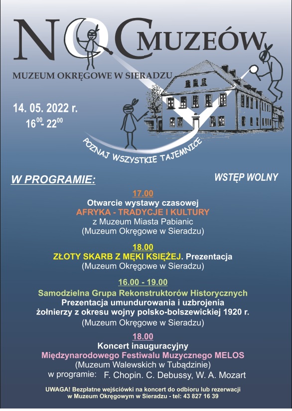 Z kolei 14 maja Muzeum zaprasza na kolejną edycję wydarzenia "Noc Muzeów". Serdecznie zapraszamy do zwiedzania naszego Muzeum 14 maja 2022 r. w godzinach 16:00 – 22:00. Wstęp wolny. Mamy przyjemność, jak co roku, zaprosić Państwa na Noc Muzeów. Tym razem odbędzie się 14 maja. Zapraszamy do Muzeum Okręgowego w Sieradzu w godzinach 16.00 - 22.00. Wstęp wolny! Pracownicy muzeum będą starali się odpowiedzieć na wszystkie Państwa pytania dotyczące eksponatów na wystawach. Przygotowaliśmy również wiele ciekawych wydarzeń. W programie: o godzinie 17.00 zostanie otwarta wystawa czasowa " Afryka - tradycje i kultury" z Muzeum Miasta Pabianic.