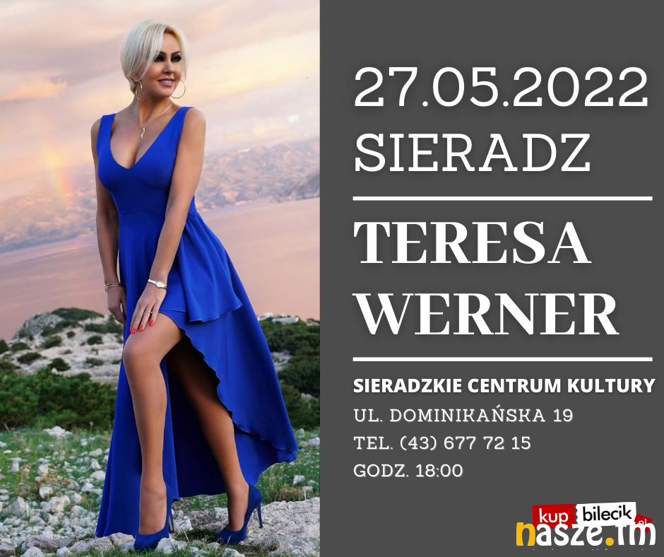 Już 27.05.2022 w Sieradzkim Centrum Kultury przy ul. Dominikańskiej wystąpi Teresa Werner. Na koncercie nie zabraknie największych przebojów artystki, a także piosenek z najnowszej płyty pt. "Sekret miłości".