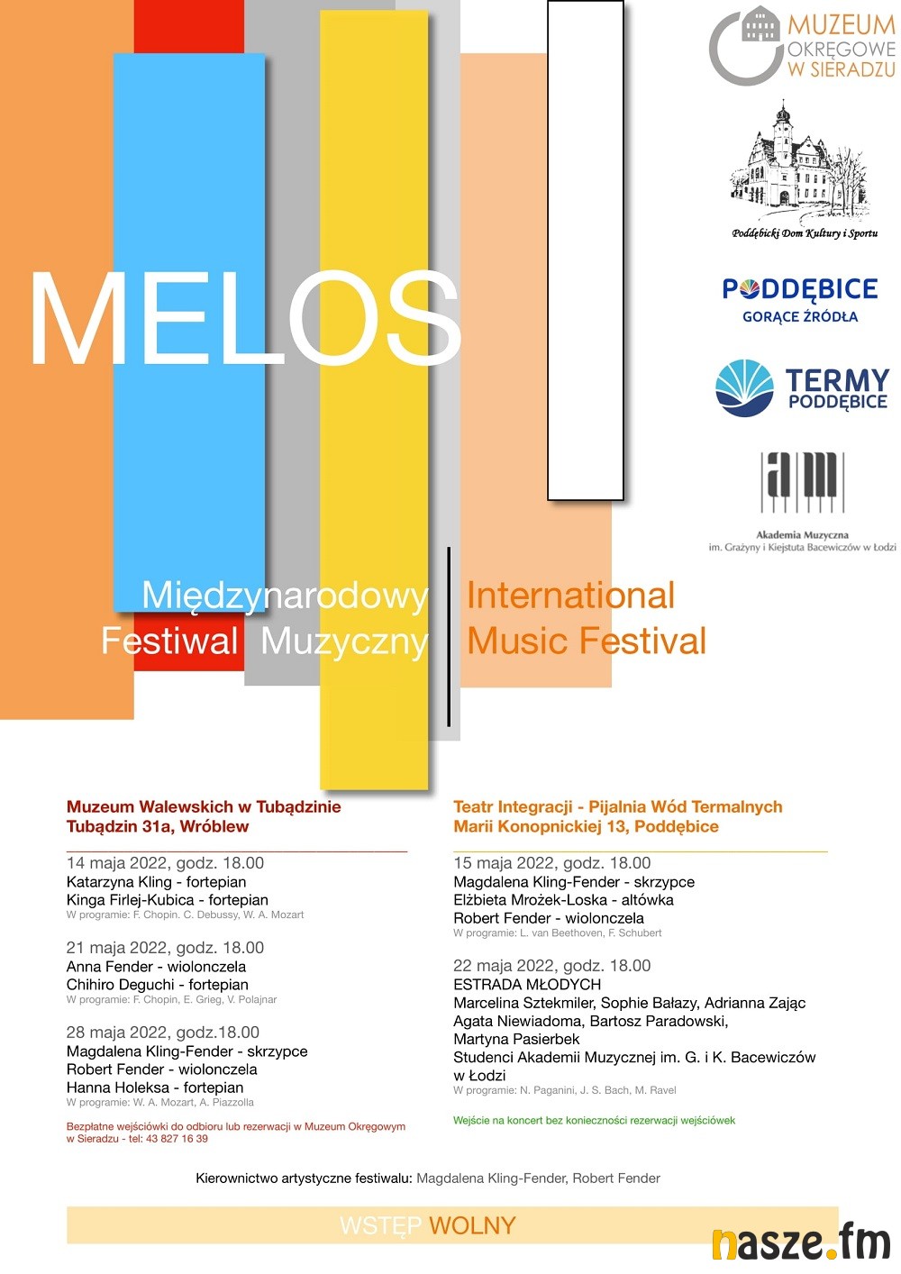W ramach festiwalu Melos w Muzeum Walewskich w Tubądzinie odbędą się trzy koncerty: 14 maja, 21 i 28 maja, muzycy wystąpią też w Poddębicach - 15 i 22 maja. Publiczność może wziąć udział w koncertach za darmo, wstęp na te w Tubądzinie z wejściówkami, które można odbierać w sieradzkim muzeum.