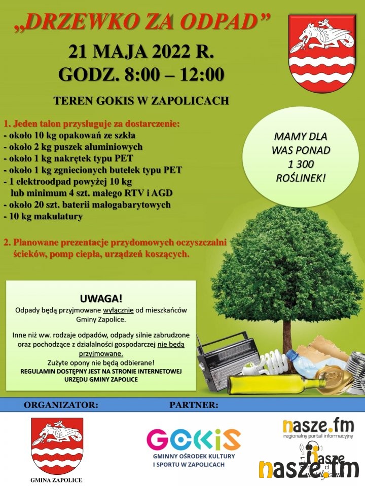 Akcja w godz. 8:00-12:00 odbędzie się na terenie Gminnego Ośrodka Kultury i Sportu w Zapolicach przy ul. Głównej 14. Mieszkańcy będą mogli wymienić niektóre frakcje selektywnie zebranych odpadów na sadzonki roślin ozdobnych. W tym roku organizatorzy przygotowali ich ponad 1300.