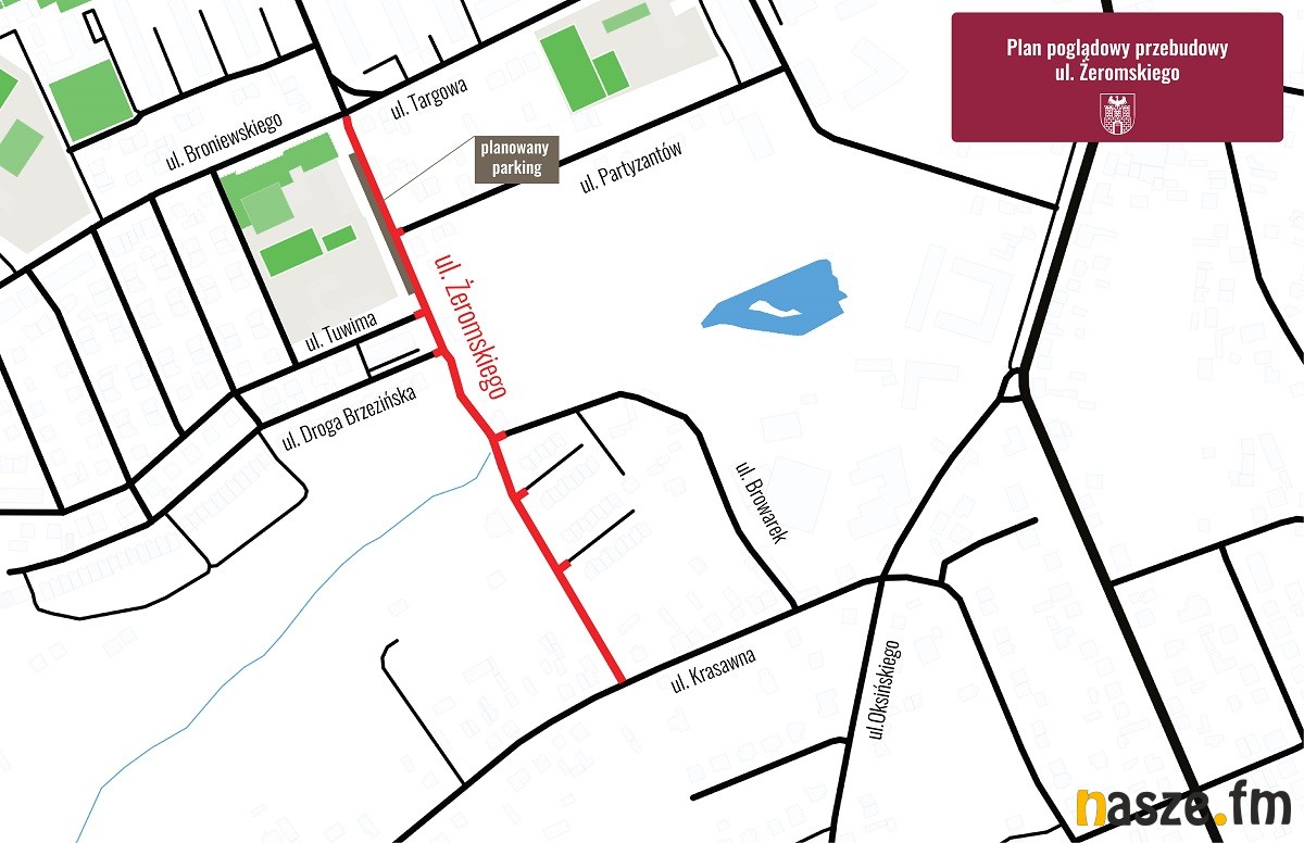 Zakres prac obejmie ok. 480 m drogi. W ramach przebudowy zaplanowano wykonanie nowej konstrukcji nawierzchni jezdni o szerokości 6 m. Po obu jej stronach (na odcinku od skrzyżowania z ulicami, Broniewskiego, Targową, Zajęczą do skrzyżowania z ul. Browarek) wykonane zostaną chodniki o szerokości 2 m. Od skrzyżowana z ul. Browarek do ul. Krasawnej, chodnik przewidziano po lewej stronie jezdni. Wzdłuż drogi, pomiędzy szkołą a ul. Tuwima, wybudowana zostanie zatoka parkingowa z prostopadłymi miejscami parkingowymi. Przebudowane zostaną również skrzyżowania z ulicami Partyzantów, Droga Brzezińska i Tuwima oraz zjazd na ul. Browarek, gdzie na długości ok. 30 m wykonany zostanie ciąg pieszo-jezdny o szerokości 3 m. Całość prac dopełnią: oświetlenie, odwodnienie, jak i również nasadzenia zieleni. Przebudowa ul. Żeromskiego powinna zacząć się najpóźniej w czerwcu tego roku.