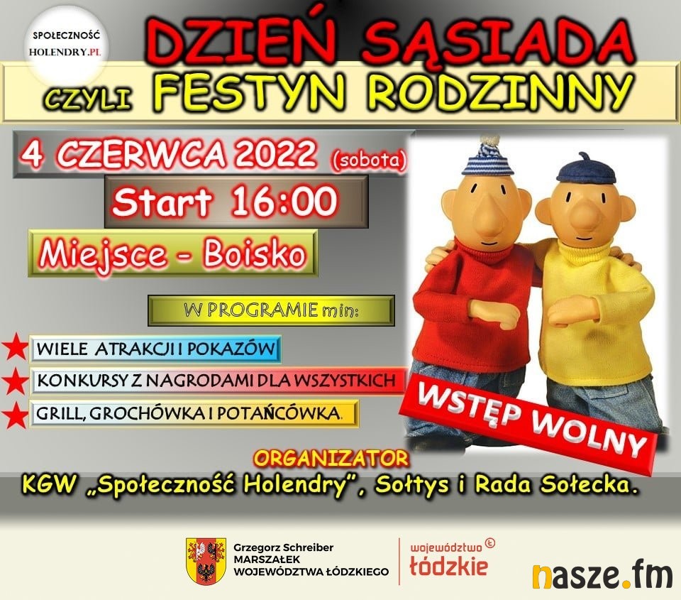 Koło Gospodyń Wiejskich „Społeczność Holendry&rdquo, Sołtys i Rada Sołecka zapraszają na Dzień Sąsiada czyli Festyn Rodzinny. W programie m.in. wiele atrakcji i pokazów, konkursy z nagrodami dla wszystkich, grill, grochówka i potańcówka. Festyn rozpocznie się o godz. 16:00.