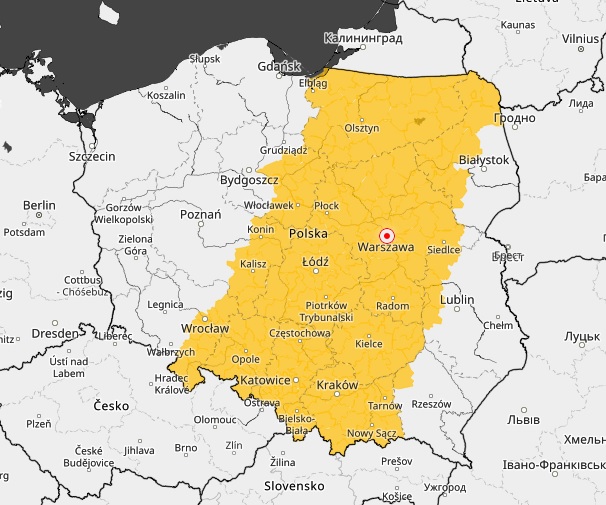 Na mapie poniżej kolorem żółtym zaznaczono obszar, dla którego instytut wydał ostrzeżenie przed burzami.