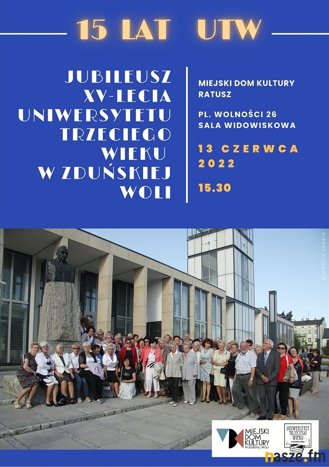 Jubileusz 15-lecia istnienia Uniwersytetu Trzeciego Wieku odbędzie się 13 czerwca (poniedziałek), o godz. 15.30 w sali widowiskowej Miejskiego Domu Kultury Ratusz.