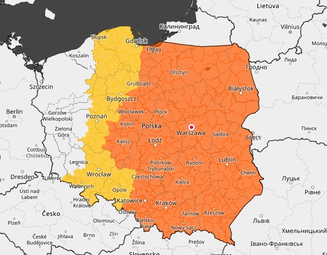 Na mapie poniżej kolorem żółtym oznaczono tereny, dla których synoptycy wydali ostrzeżenie pierwszego stopnia, pomarańczowym - drugiego. Ostrzeżenia będą aktualne dziś do godz. 20:00