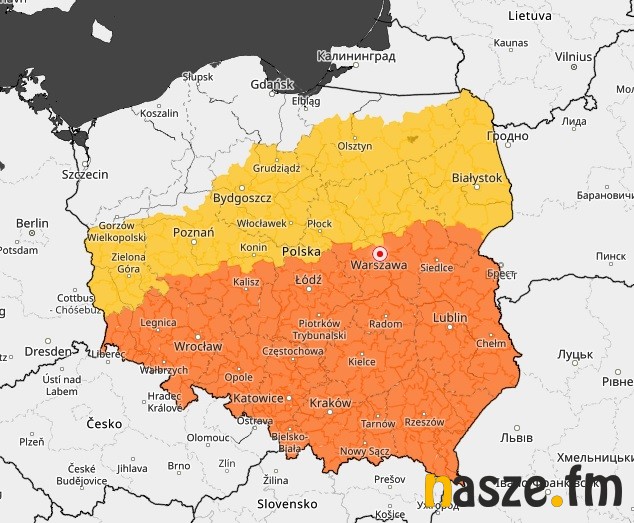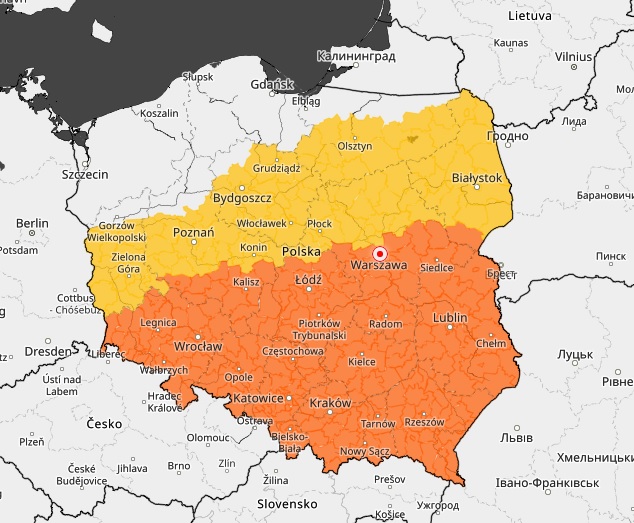 Na mapie poniżej kolorem żółtym zaznaczono obszar, dla którego IMGW wydał ostrzeżenie pierwszego stopnia, pomarańczowym - drugiego.