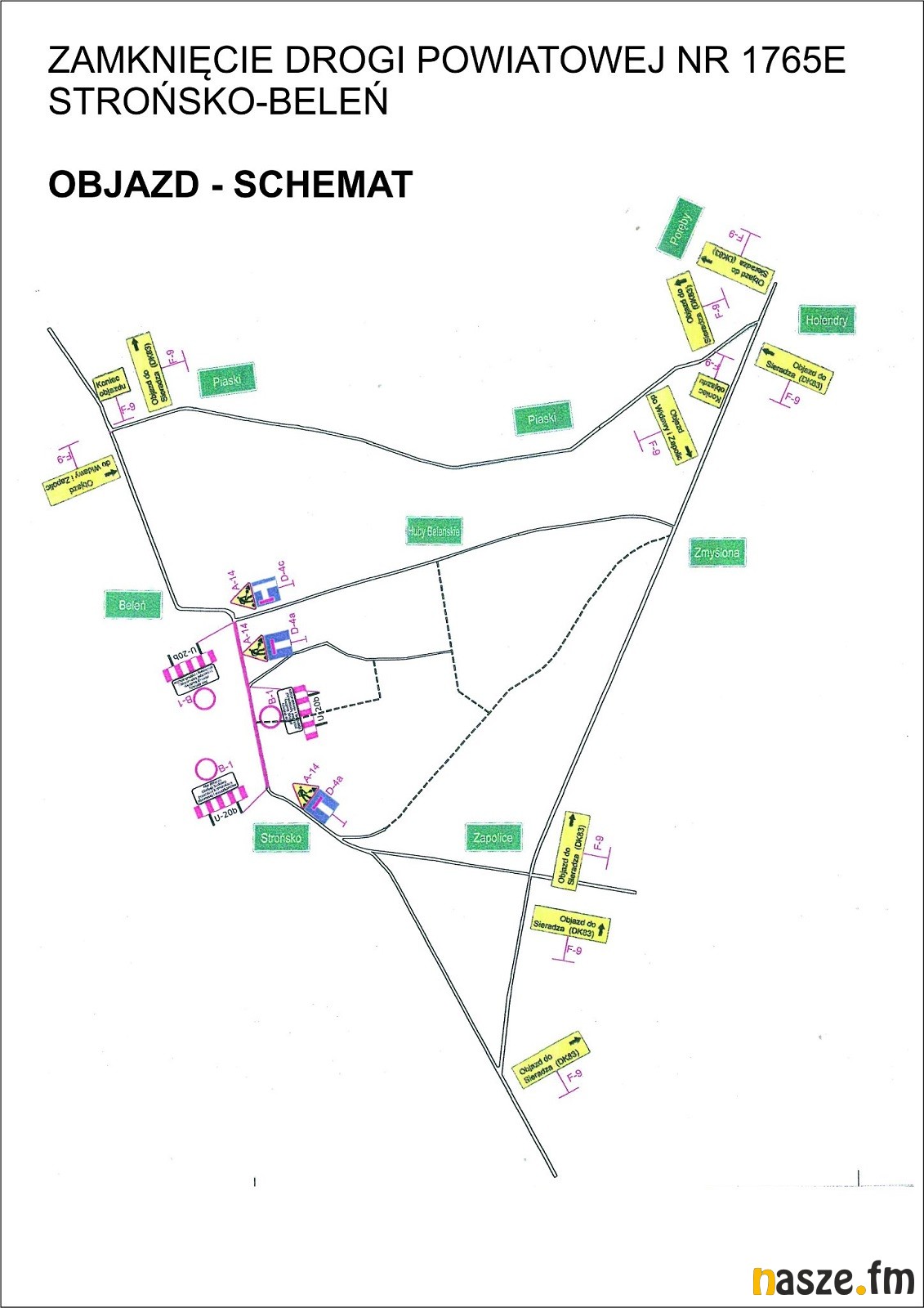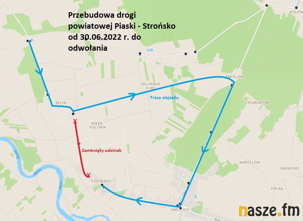 Uwaga kierowcy! Dziś całkowicie zamknięty dla ruchu zostanie odcinek drogi powiatowej pomiędzy Strońskiem a Beleniem. Objazd do Sieradza wytyczony został przez Holendry i Piaski. Dotyczy to również komunikacji autobusowej.