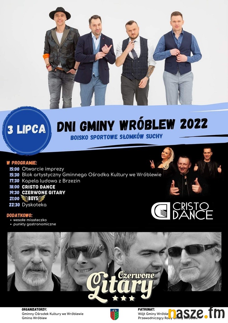 Po oficjalnym otwarciu imprezy (godz. 15) rozpocznie się blok artystyczny podopiecznych Gminnego Ośrodka Kultury we Wróblewie. Publiczności zaprezentuje się potem Kapela Ludowa z Brzezin, a potem estradę przejmie Christo Dance. Kolejny punkt programu to koncert Czerwonych Gitar, a potem zespołu Boys. Dni Wróblewa zakończy dyskoteka pod gwiazdami.