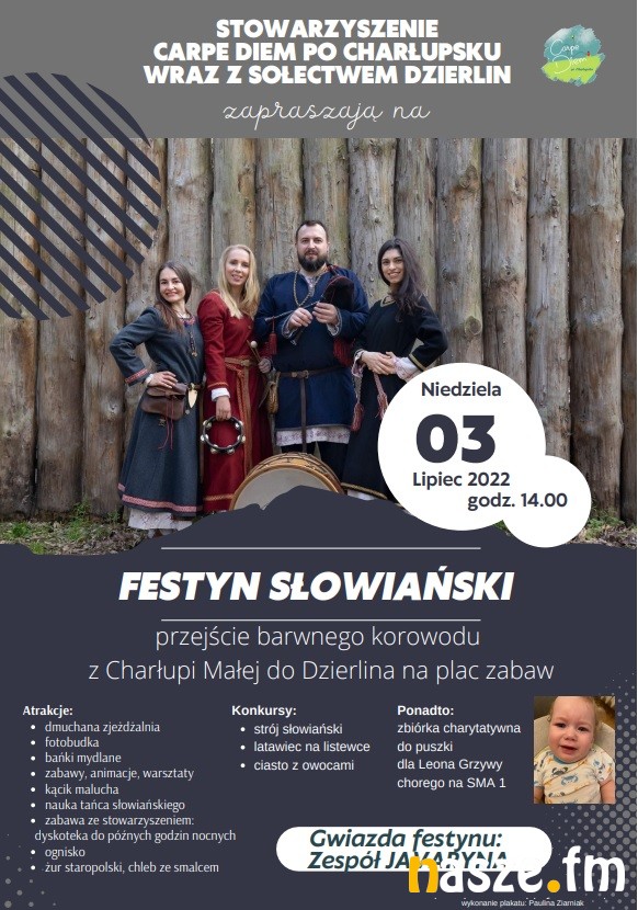 Stowarzyszenie Carpe Diem po Charłupsku i sołectwo Dzierlin zapraszają w najbliższą niedzielę na Festyn Słowiański. Będzie mnóstwo atrakcji: nauka tańca słowiańskiego, ognisko, dyskoteka, konkursy i zabawy. Dla wszystkich będzie przygotowany żur staropolski, ziemniaki z gziczką, kiełbaski i napoje.