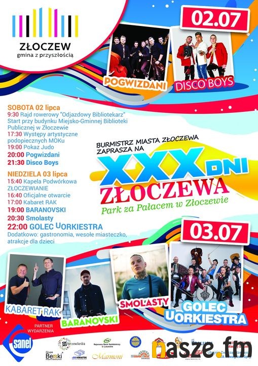 Z kolei niedziela to na dobry początek występ kapeli Złoczewianie (15:40). Po oficjalnym otwarciu Dni Złoczewa na estradzie pojawi się kabaret RAK (17:00). Koncertować będą zaś Baranowvski (19:00), Smolasty (20:30) i Golec uOrkiestra (22:00).