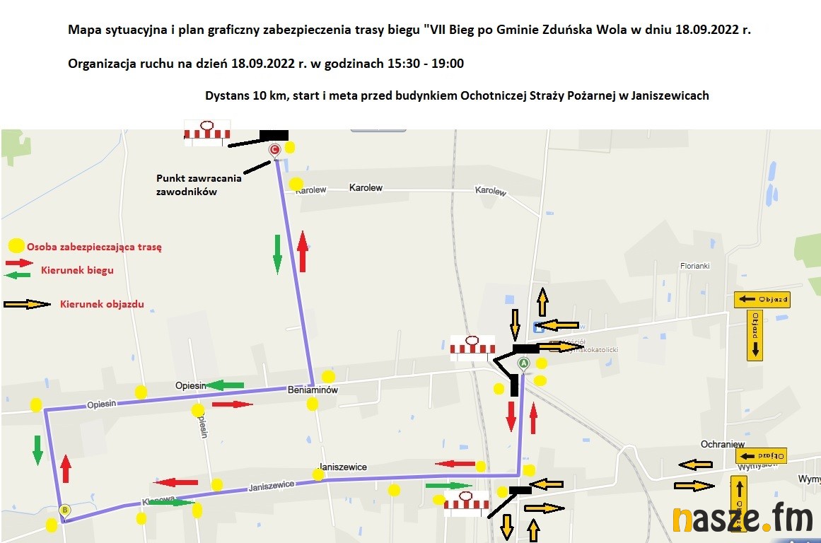 Uwaga kierowcy! W związku z organizacją biegu droga powiatowa Zduńska Wola – Szadek, na odcinku Maciejów – Janiszewice będzie zamknięta dla ruchu w godzinach 16:00-19:00, wyznaczony został objazd przez miejscowość Ochraniew. W godzinach 17:00-18:30 wystąpią utrudnienia w poruszaniu się w miejscowościach: Janiszewice, Maciejów, Opiesin, Beniaminów.
