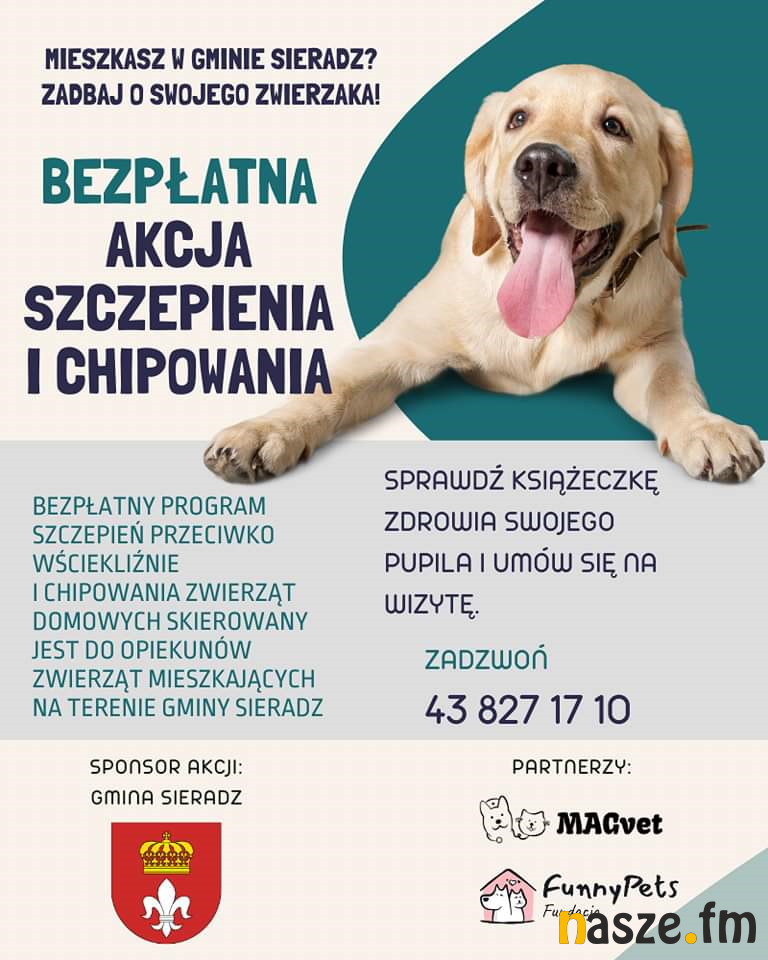 Fundacja Schroniska Funny Pets zaprasza także mieszkańców Gminy Sieradz do udziału w bezpłatnej akcji szczepienia przeciwko wściekliźnie oraz chipowania zwierząt domowych. Szczegóły znajdziecie na poniższym plakacie.