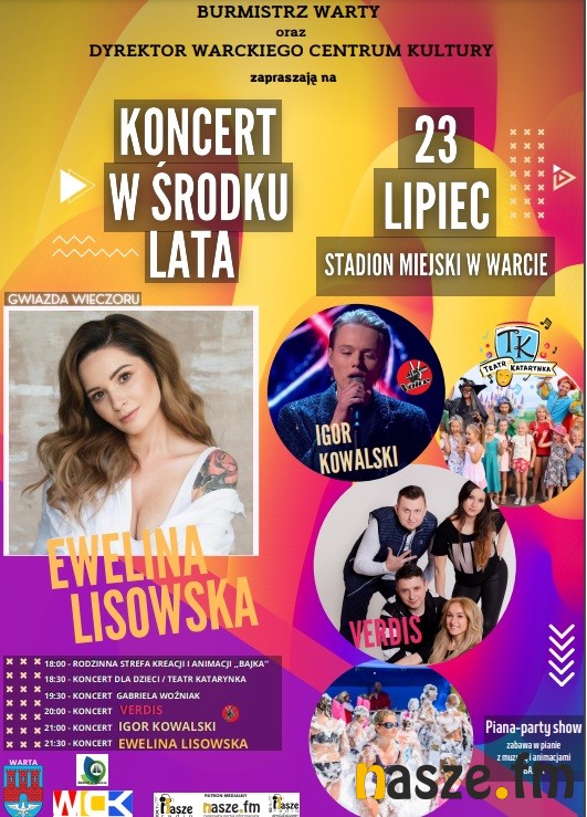 Na takie letnie wydarzenie zapraszają Burmistrz Warty oraz Dyrektor Warckiego Centrum Kultury. Koncerty odbędą się 23 lipca. Na scenie wystąpią m.in. Igor Kowalski oraz zespół Verdis. Gwiazdą wieczoru będzie Ewelina Lisowska. Będzie też rodzinna strefa kreacji i animacji "Bajka". Nie zabraknie atrakcji dla dzieci i dorosłych.