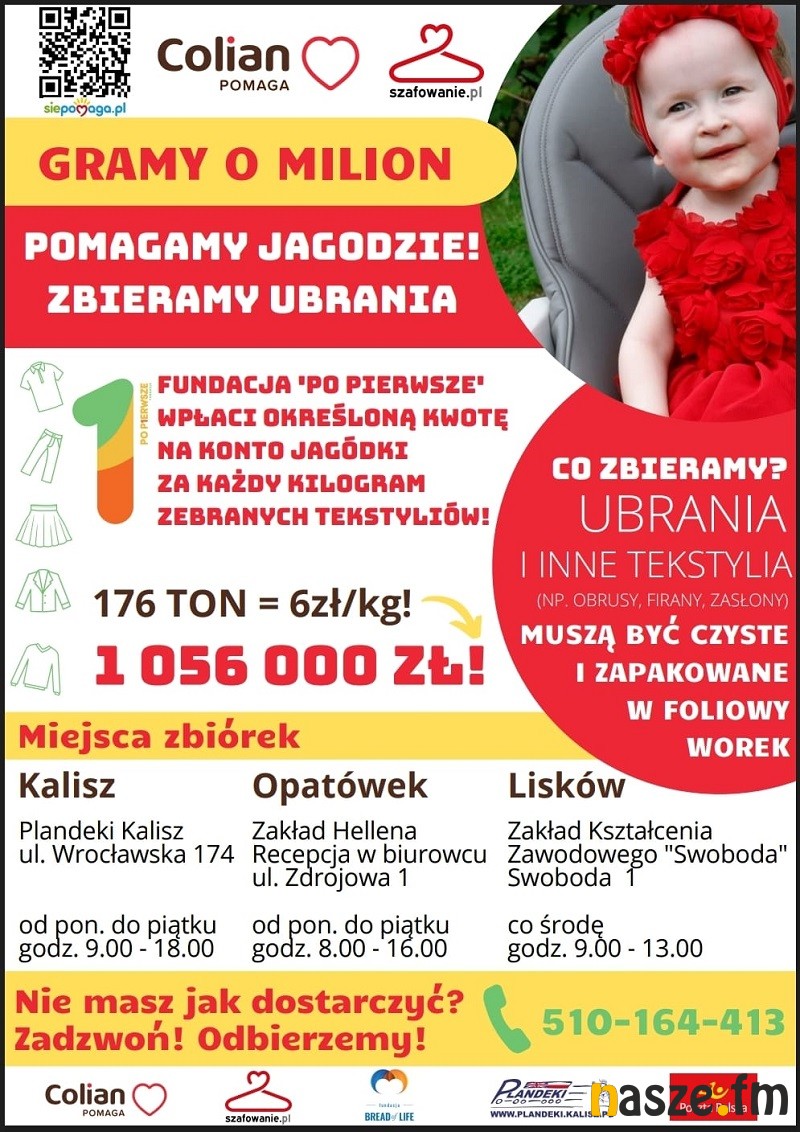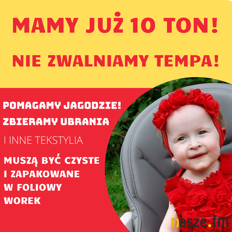 - Fundacja”Po pierwsze” zapłaci 1056000 zł na rzecz Jagódki, pod warunkiem, że uda się uzbierać 176 ton tekstylii (używane, czyste ubrania, buty, zabawki, firanki, koce, pościele itp.) - informują organizaotrzy