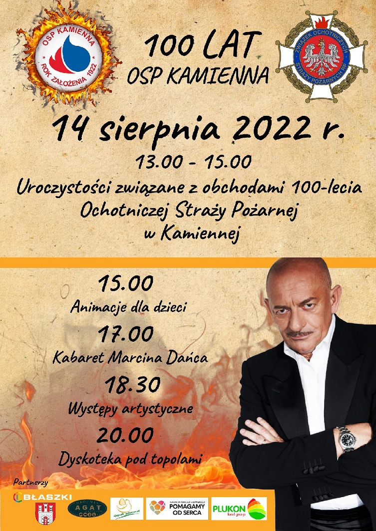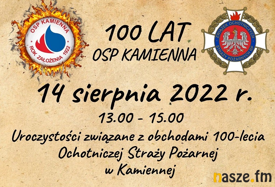 Strażackie święto odbędzie się na boisku LKS Kamienna. Oficjalna część rozpocznie się o godz. 13:00 i potrwa do 15:00. Jednostce zostanie przekazany nowy sztandar i nagrody, a strażakom odznaczenia za wysługę lat. Po części oficjalnej będzie czas na zabawę, nie zabraknie atrakcji dla najmłodszych. O godz. 17:00 swój występ rozpocznie Marcin Daniec. Święto strażaków w Kamiennej zakończy się dyskoteką pod topolami.
