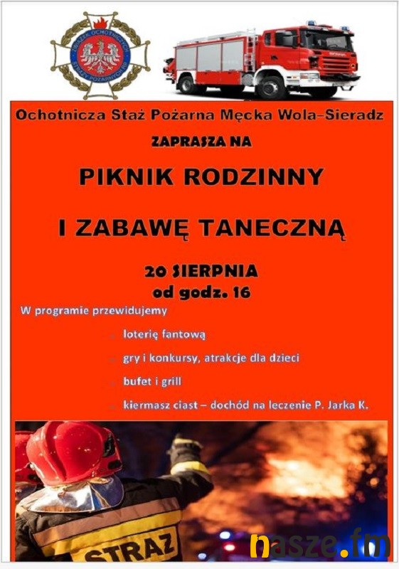 Ochotnicza Straż Pożarna z Męckiej Woli zaprasza jutro, 20 sierpnia, na piknik rodzinny i zabawę taneczną. Podczas wydarzenia zbierane będą pieniądze na leczenie Jarosława Kielera.