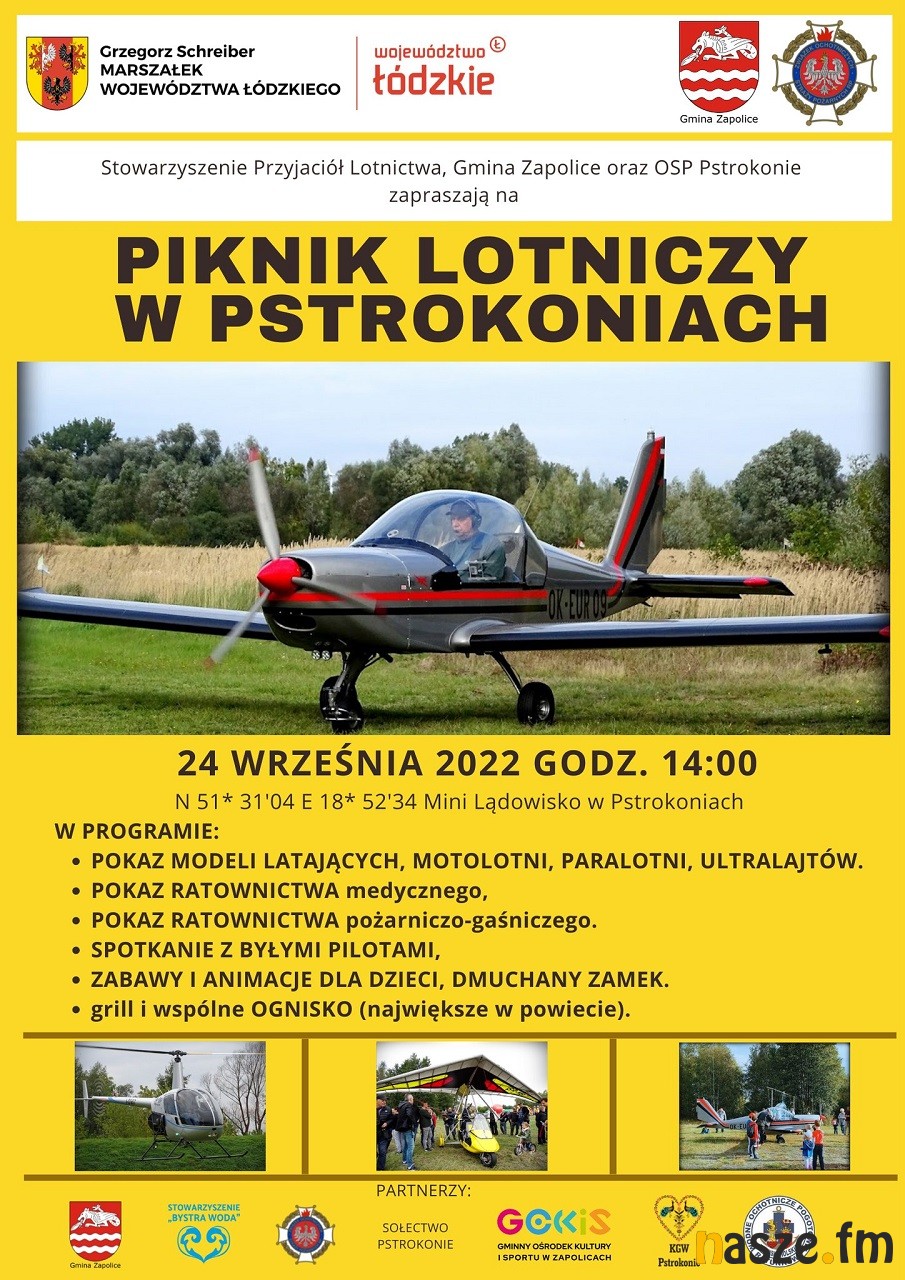 Na wydarzenie zapraszają: Stowarzyszenie Przyjaciół Lotnictwa, Gmina Zapolice oraz OSP Pstrokonie.