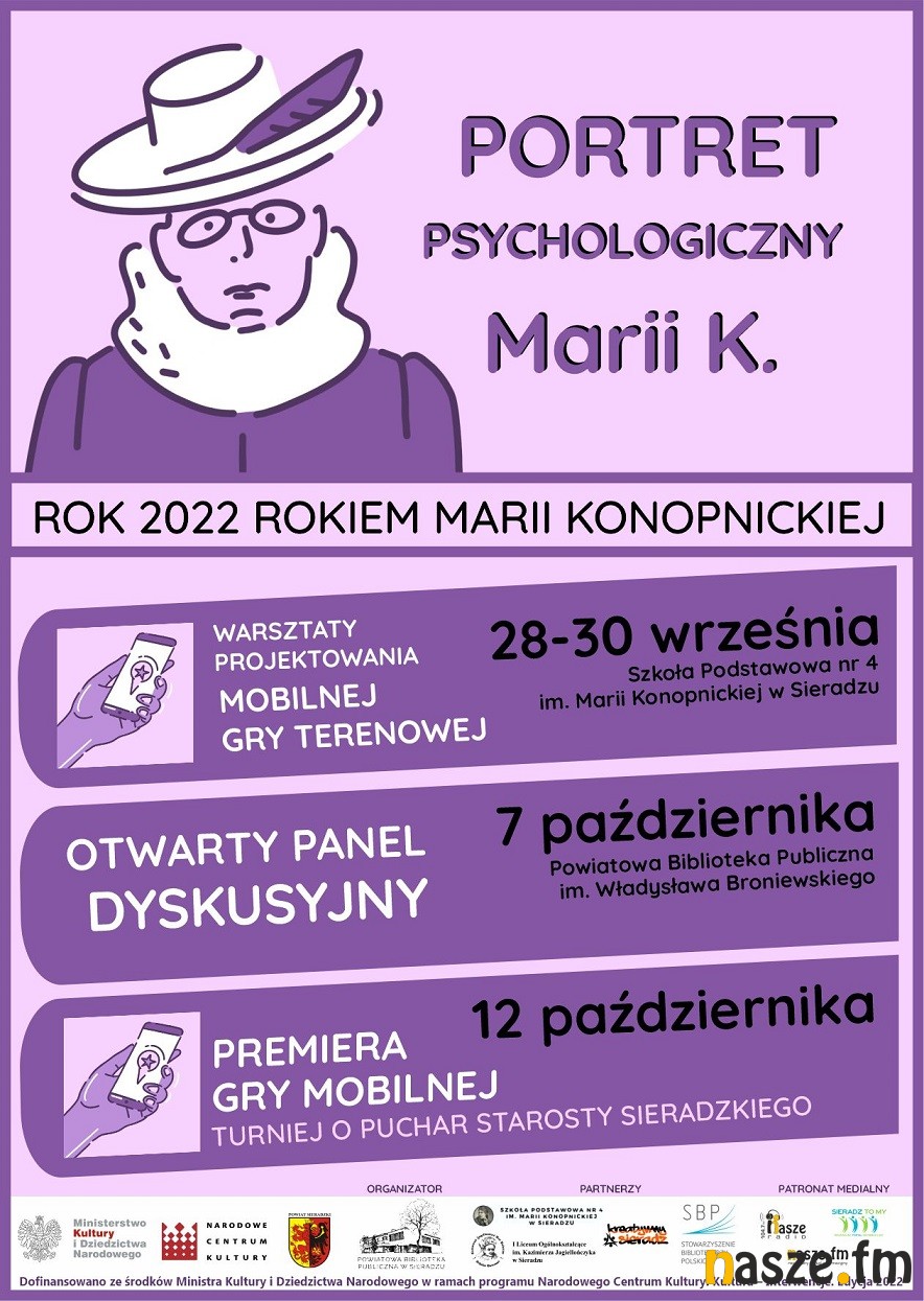 "Portret psychologiczny Marii K.", druga część projektu, to otwarty panel dyskusyjny. Odbędzie się w piątek 7 października w PBP w Sieradzu, gdzie przedstawiciele muzeów związanych z Marią Konopnicką, historycy, literaturoznawcy opowiedzą o jej życiu i twórczości. O tajemnicach poetki, poszukiwaniu i analizowaniu dokumentów opowie autorka najnowszej książki o Konopnickiej. Uczniowie szkół średnich wspólnie z psychologiem przyjrzą się działaniom pisarki związanym z publicznym wizerunkiem. Porównają to z możliwościami, jakie dają dziś media społecznościowe. Dowiedzą się jak rozpoznać manipulację i jak się przed tym bronić. Spotkanie rozpocznie się o godz. 8:30.