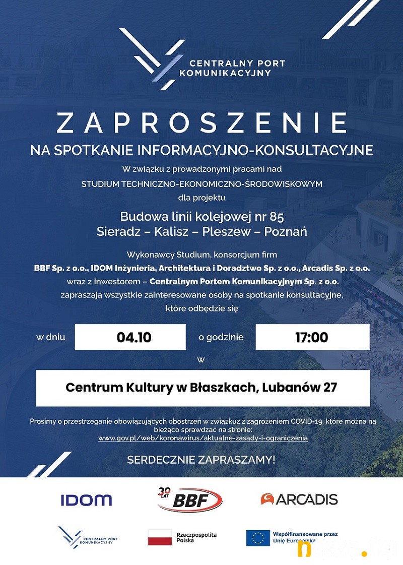 W dniu 04.10 o godz. 17 w Centrum Kultury W Błaszkach z siedzibą w Lubanowie odbędzie się spotkanie informacyjne w sprawie budowy linii kolejowej NR 85.