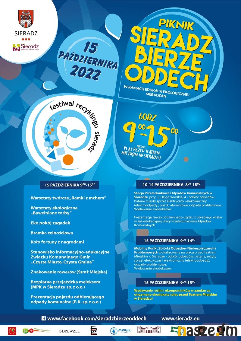 Już w najbliższą sobotę, 15 października, zapraszamy na kolejną edycję Pikniku Sieradz Bierze Oddech oraz XVII Festiwal Recyklingu. Oba wydarzenia odbędą się tradycyjnie na placu przed Teatrem Miejskim.