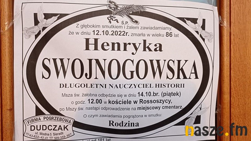 W wieku 86 lat zmarła Henryka Swojnogowska, wieloletnia nauczycielka historii oraz wychowawczymi młodzieży. Przez wiele lat zawodowo związana była z I Liceum Ogólnokształcącym im. Kazimierza Jagiellończyka w Sieradzu.