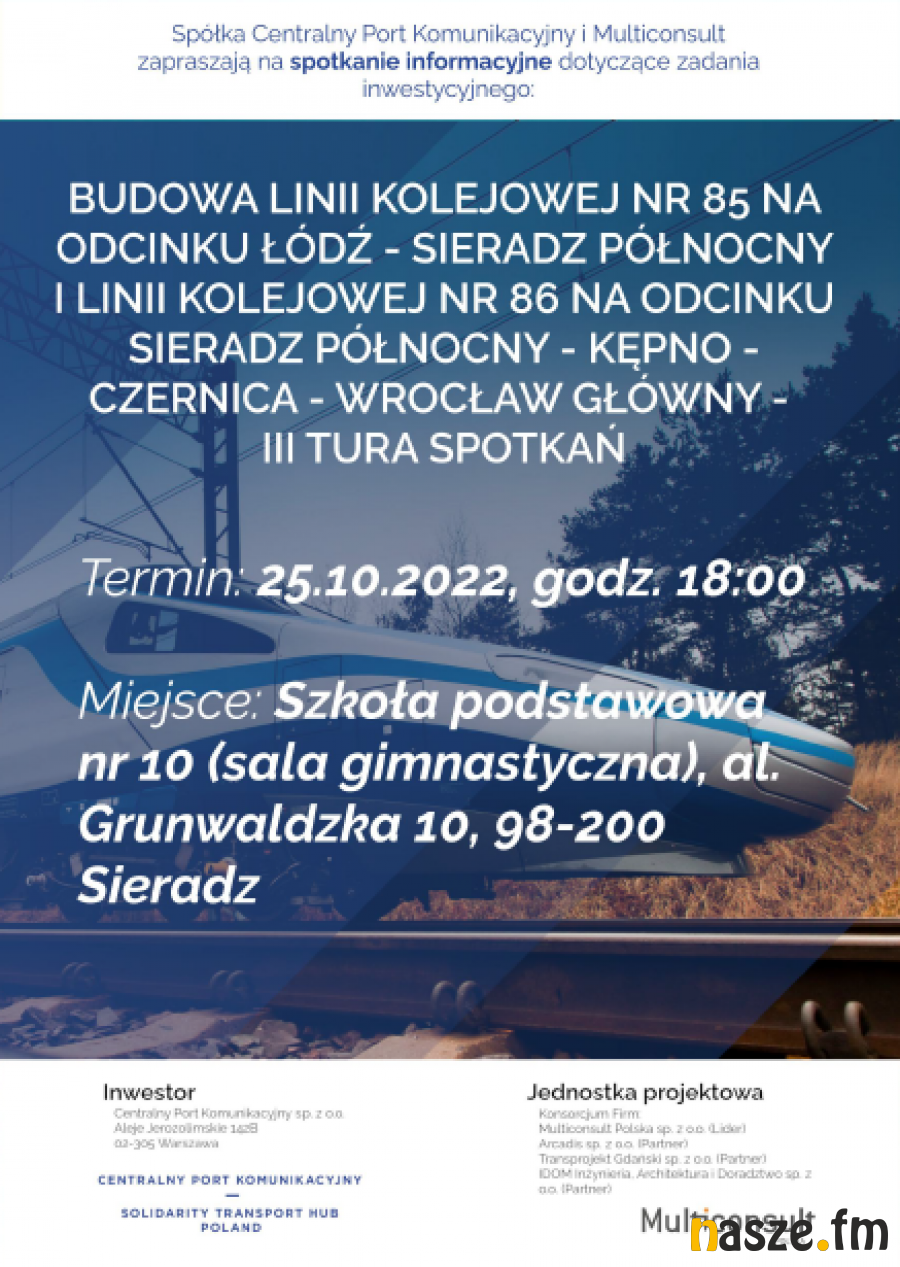 Przypominamy wszystkim zainteresowanym o spotkaniu informacyjnym dotyczącym wybranego wariantu inwestorskiego przebiegu Kolei Dużych Prędkości przez Sieradz. Spotkanie odbędzie się dziś o godz. 18.00 w Sali Gimnastycznej Szkoły Podstawowej nr 10 w Sieradzu (al. Grunwaldzka 10).