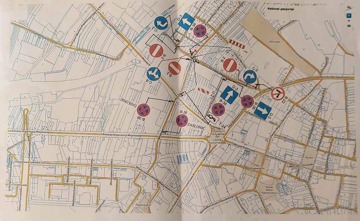 - ul. POW i Wojska Polskiego w związku ze zmianą organizacji ruchu w rejonie ul. Bazylika - zgodnie ze schematem zamieszczonym poniżej.